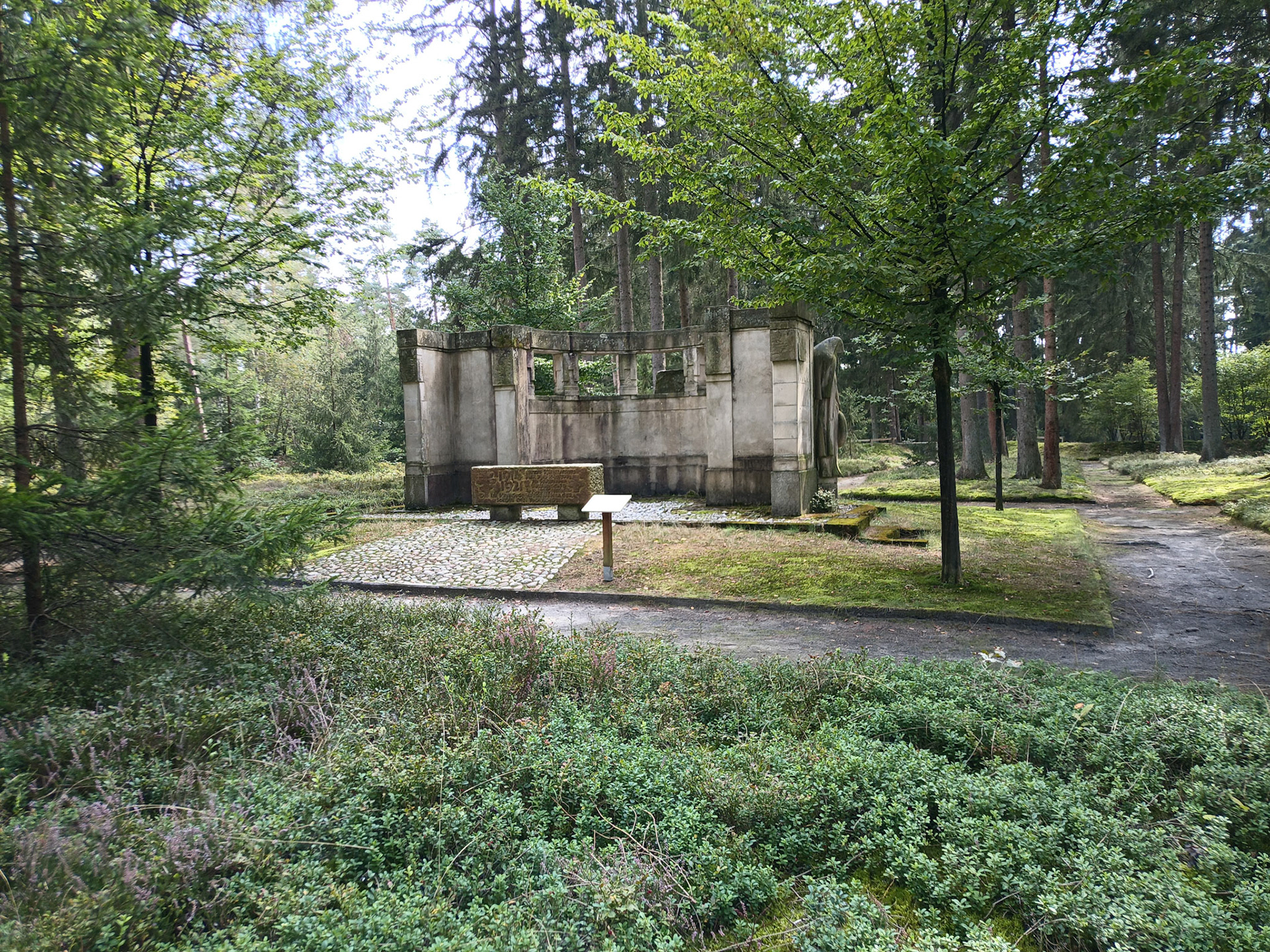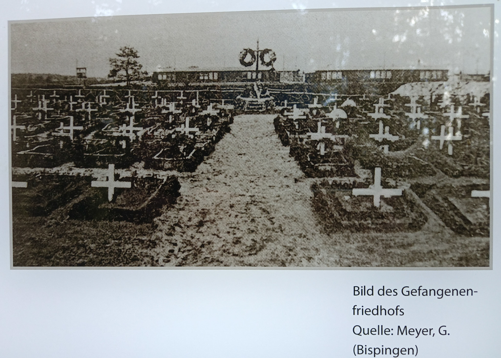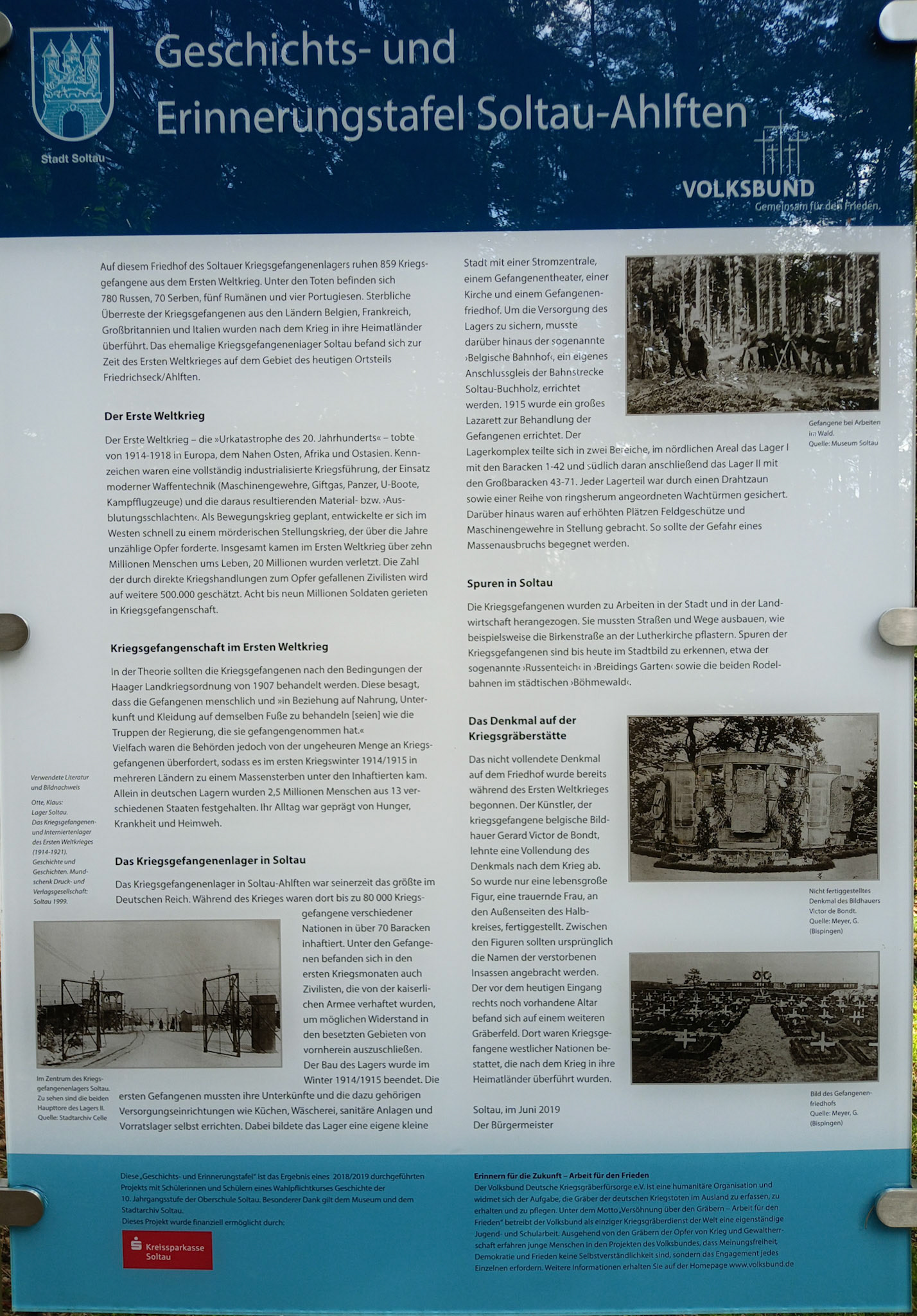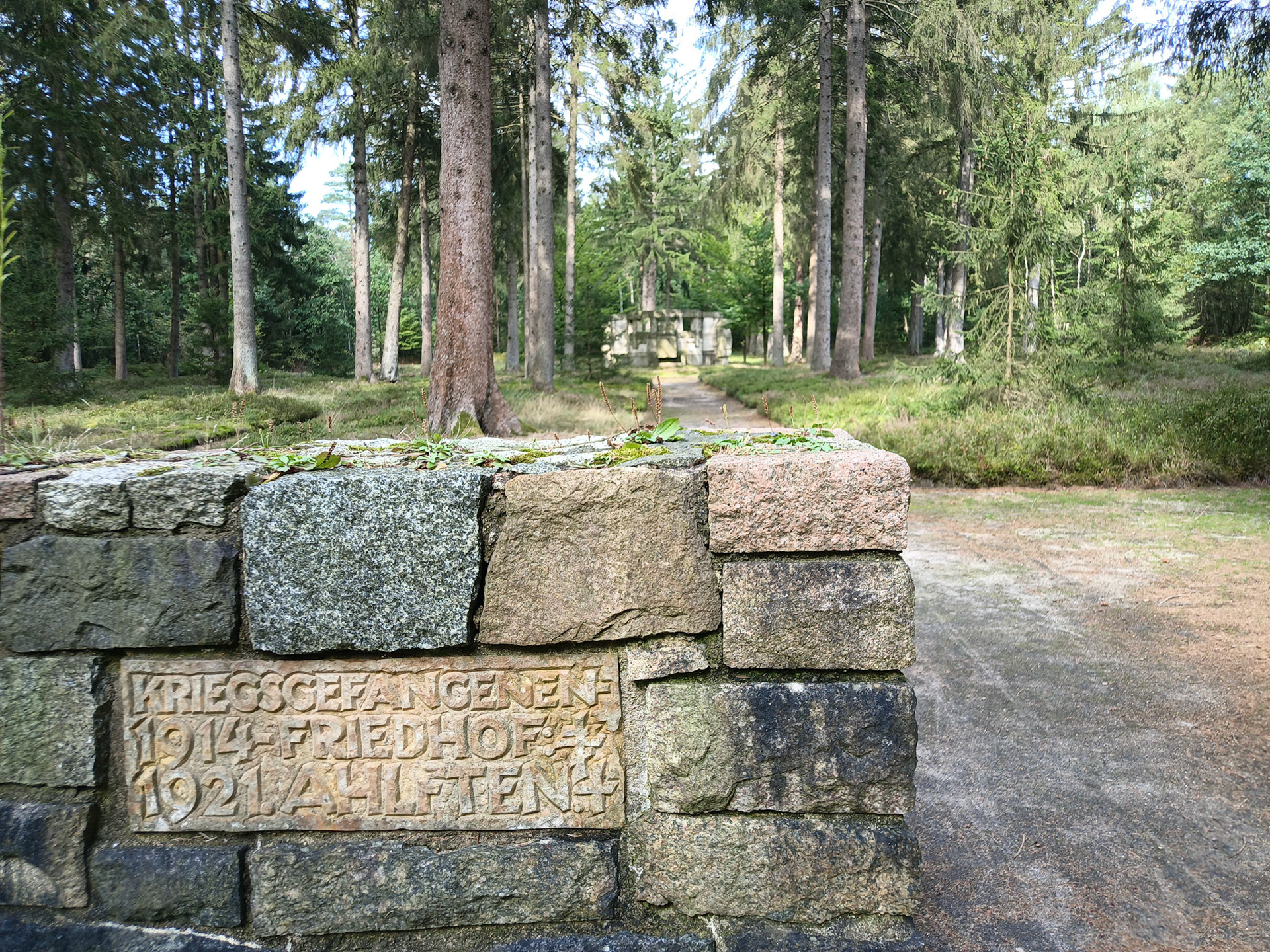 Auf diesem Friedhof in unmittelbarer Nähe des Heideparks Soltau ruhen 859 verstorbene Kriegsgefangene des Ersten Weltkrieges aus dem Kriegsgefangenenlager Soltau aus unterschiedlichen Ländern. Wer hier begraben ist und wann sie gestorben sind, ist nicht bekannt, Namen wurden nicht vermerkt. Das Lager Soltau war das größte Kriegsgefangenenlager in Deutschland und wurde 1915 bezugsfertig. In ihm waren bis zu 80 000 Kriegsgefangene interniert, hauptsächlich Franzosen, Serben, Belgier und Russen. Das Denkmal wurde von dem Belgischen Bildhauer Gerard Victor de Bondt noch während des Krieges als Kriegsgefangener begonnen, weigerte sich aber, es nach Kriegsende fertig zu stellen. So sieht man auf der linken Seite eine Frau und auf der rechten nur einen Block.