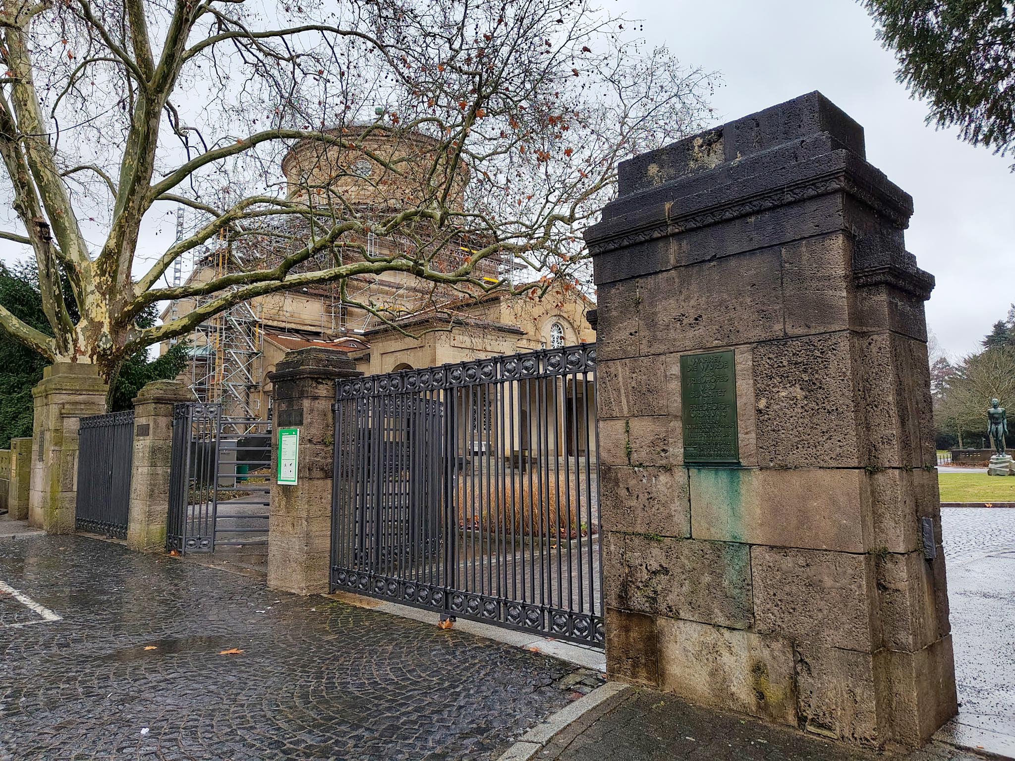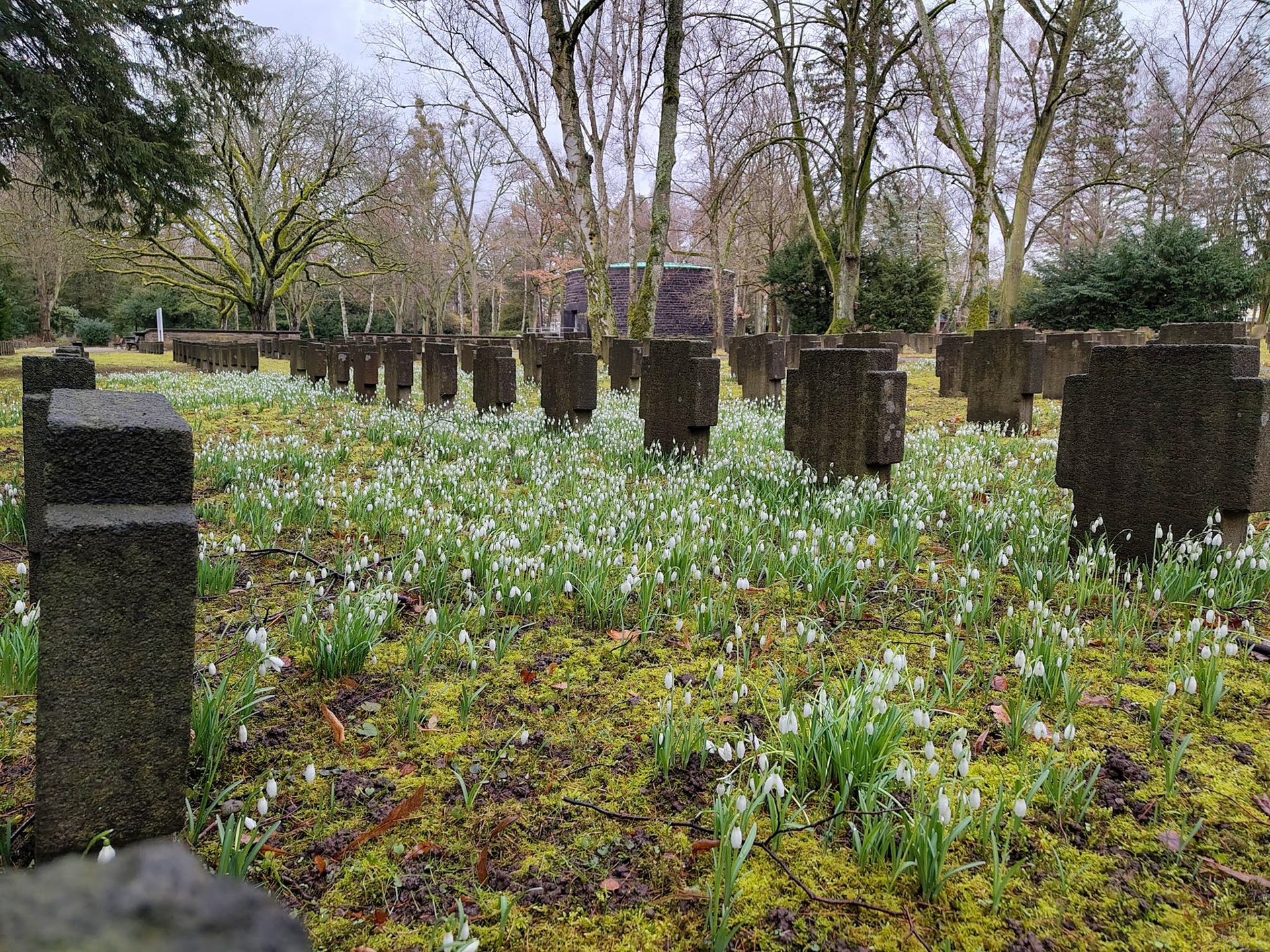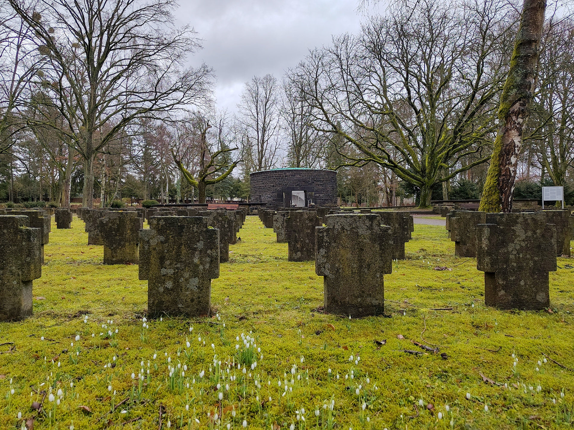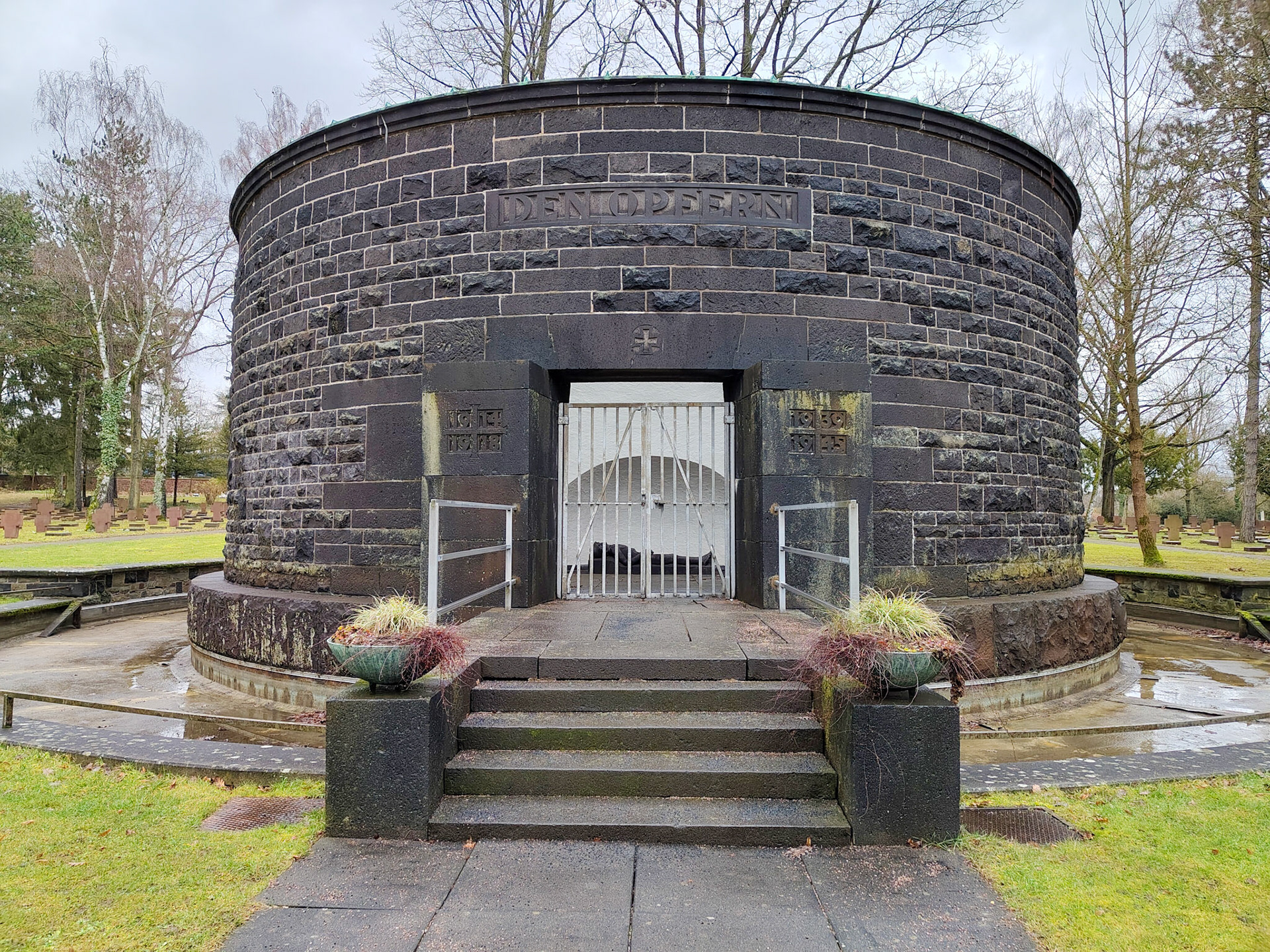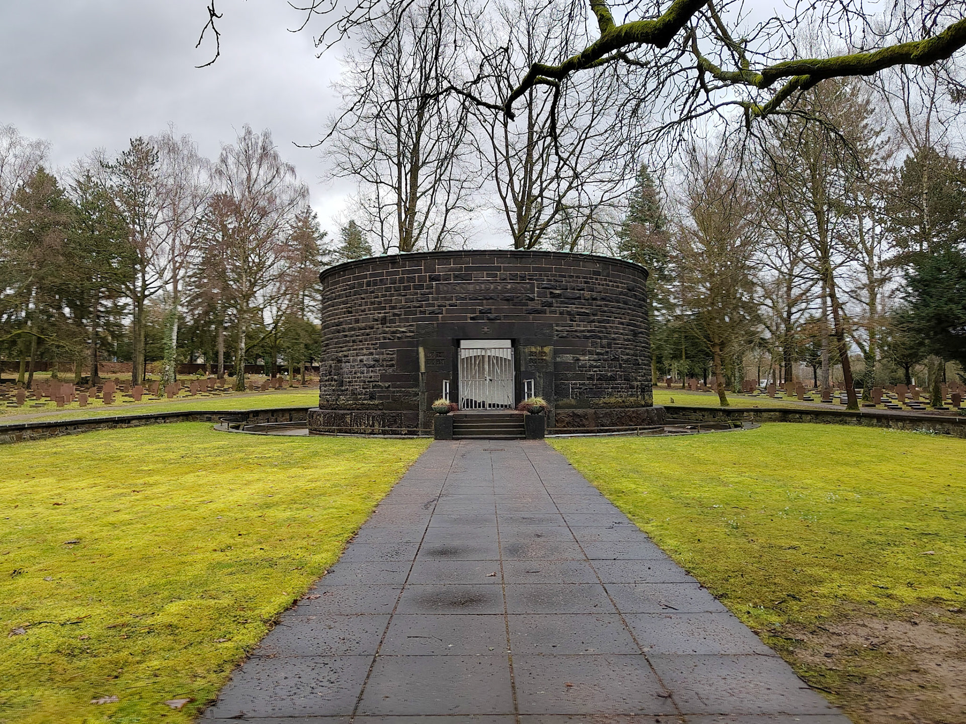 Der Hauptfriedhof in Frankfurt ist riesig, daher bekommen die Kriegsgräber einen eigenen Platz. Den Mittelpunkt der Kriegsgräberfelder bildet ein prägnanter Rundbau. Das "Ehrenmal" wurde 1928 zum Gedenken an ihre Toten des Ersten Weltkriegs errichtet. Die Skulptur "der liegende Krieger" im inneren beeindruckt ebenso wie der Ausblick aus der runden Öffnung in der Decke, durch die man in den Himmel schauen kann.